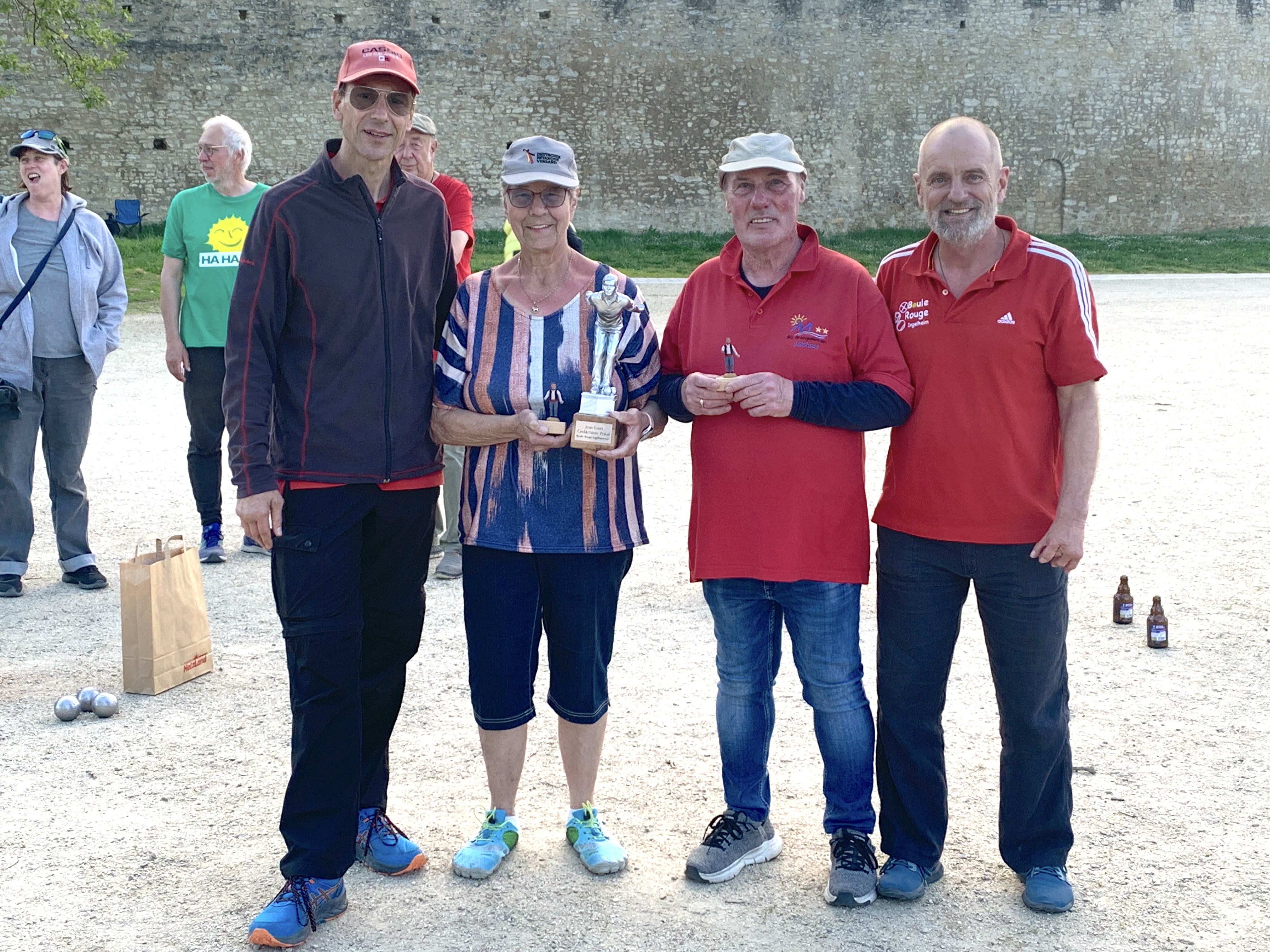 v.l.n.r. Stefan Bunge (Boule-Rouge Ingelheim), 1. Platz MathildeMeder (BC Rheingrafenstein), 1. Platz Michael Bosenbeck (BC Rheingrafenstein), Thomas Thull (Boule-Rouge Ingelheim)